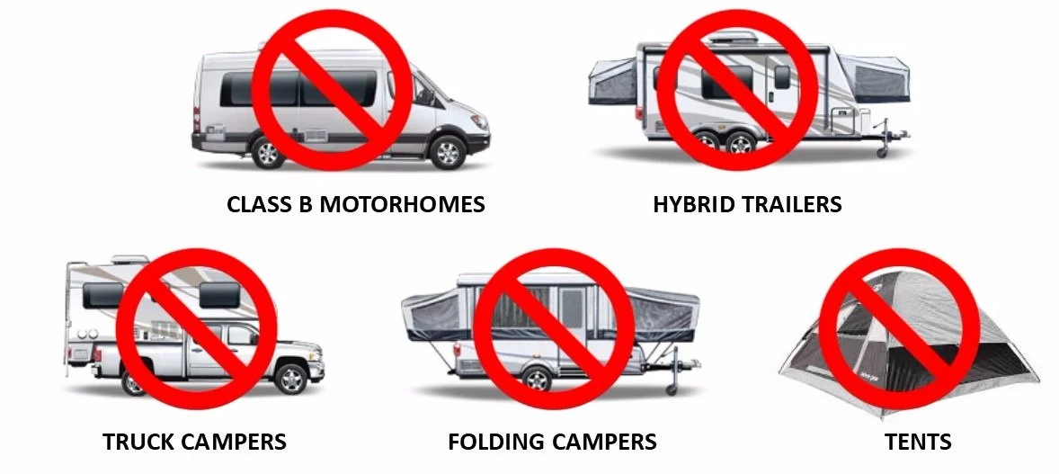 Travel trailers must meet park age and condition requirements. The maximum permitted park model size is 13 feet wide and up to 40 feet in length.